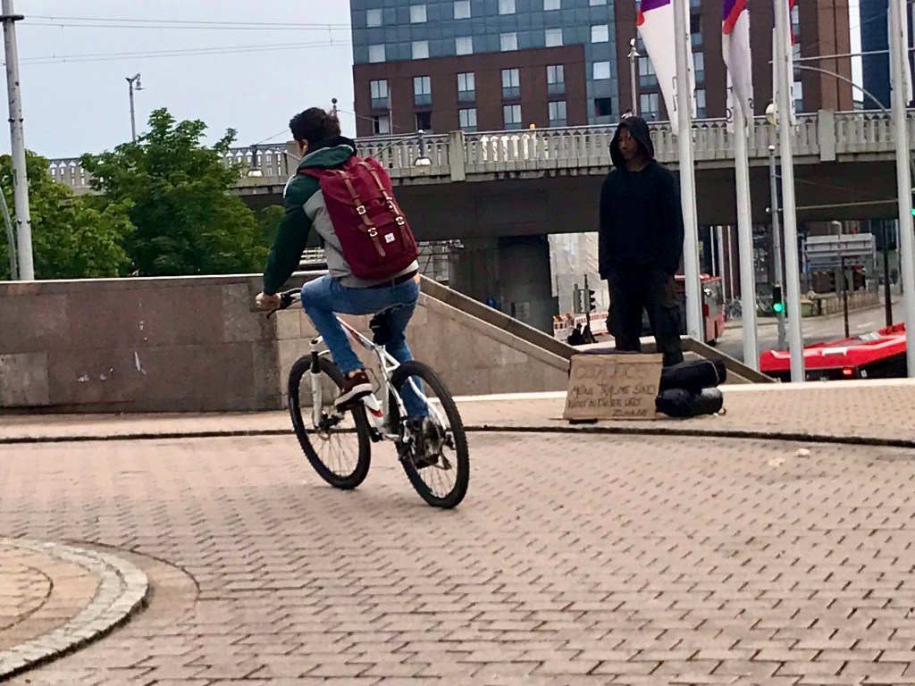 Vor ihm stand ein Schild, daneben eine Schale. Ein Obdachloser? Aber er sieht so gar nicht nach einem Obdachlosen aus!
